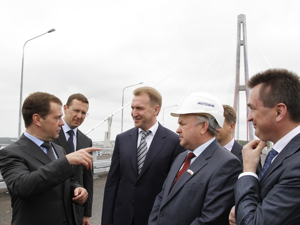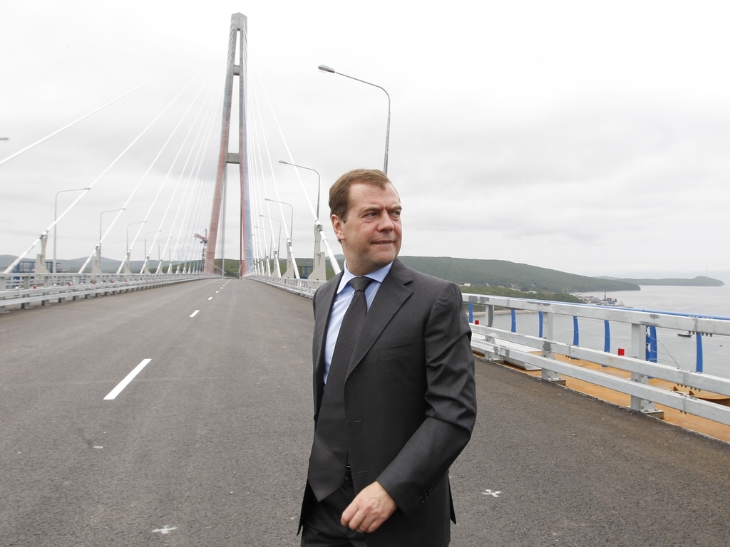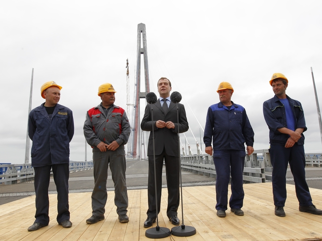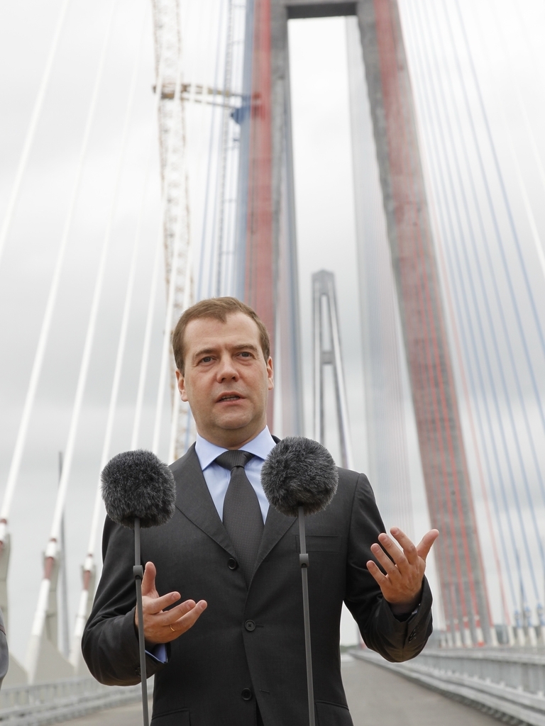 Председатель Правительства Российской Федерации Д.А.Медведев, прибывший с рабочей поездкой во Владивосток, принял участие в церемонии открытия движения по мосту через пролив Босфор Восточный